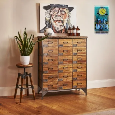 Industrial & Urban: Here, the wood is often darker or left in a reclaimed state, showcasing knots, grain, and a lived-in texture. It may be paired with metal frames, iron handles, or casters. Think chunky drawer fronts and a robust silhouette that adds an element of raw, urban edge to a loft or apartment.